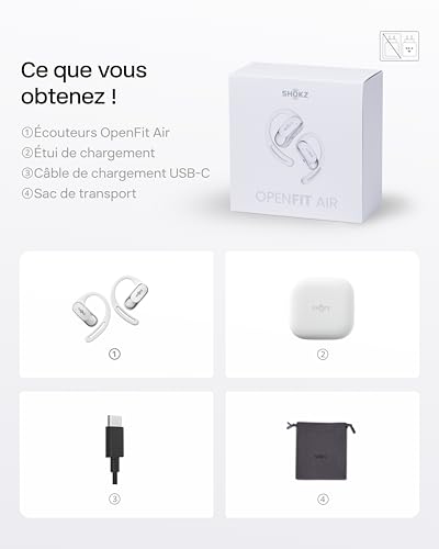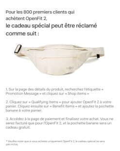 - Pour l’achat des écouteurs OpenFit Air, un étui transparent vous est offert gratuitement. Pour bénéficier de cette offre : cliquez sur « Comment obtenir l’offre » sur la page du produit, puis ajoutez à la fois les écouteurs et l’étui transparent à votre panier. Attention, si vous n’ajoutez que les écouteurs, vous ne recevrez pas l’étui transparent.