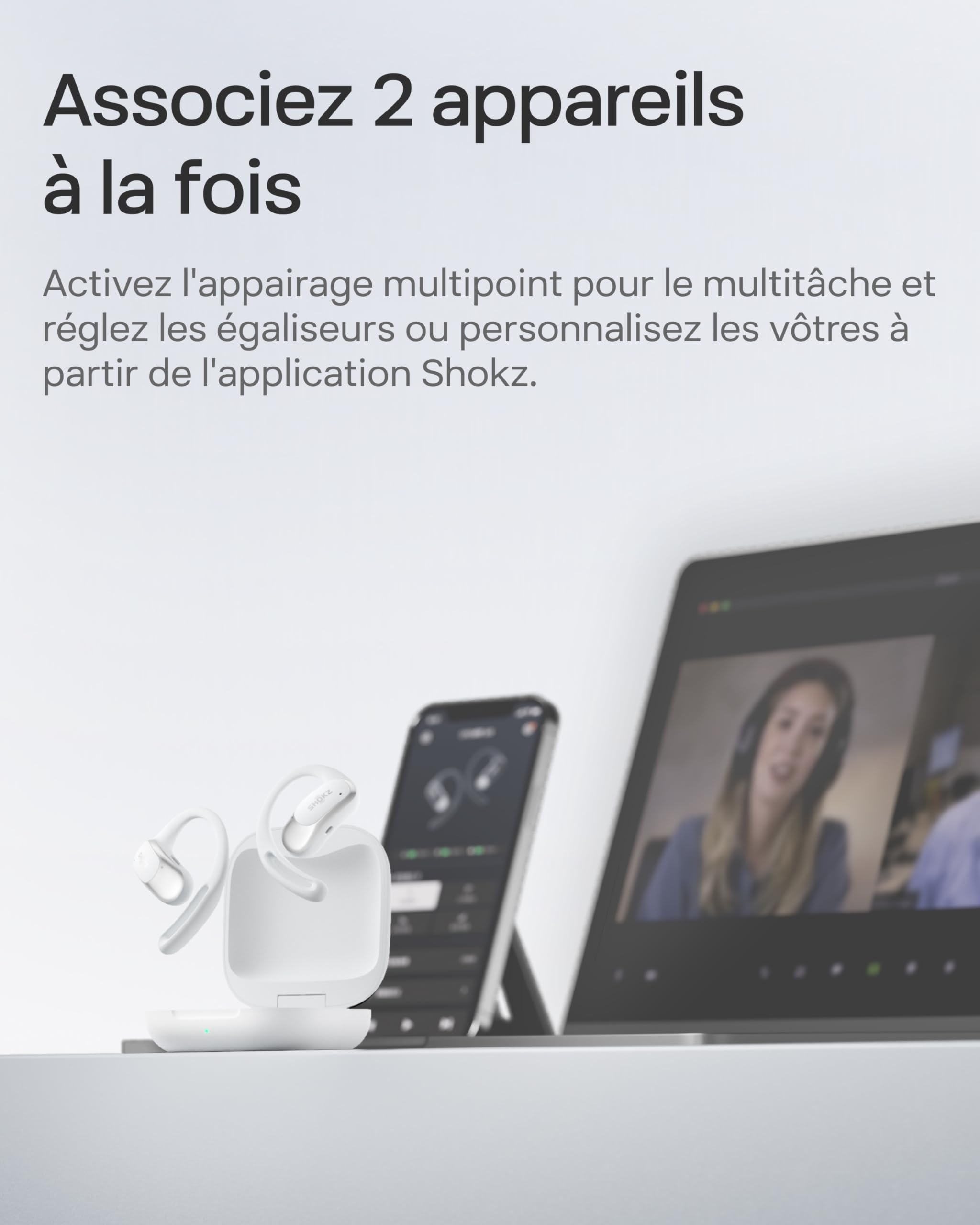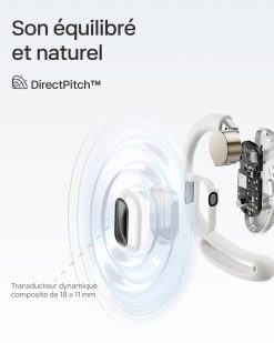 - Un son plus vrai que nature : Avec notre technologie exclusive DirectPitch vos contenus audio restent là où ils doivent être, avec encore moins de fuites sonores. Personnalisez encore votre son avec l’application Shokz et 4 modes d’égalisation prédéfinis.