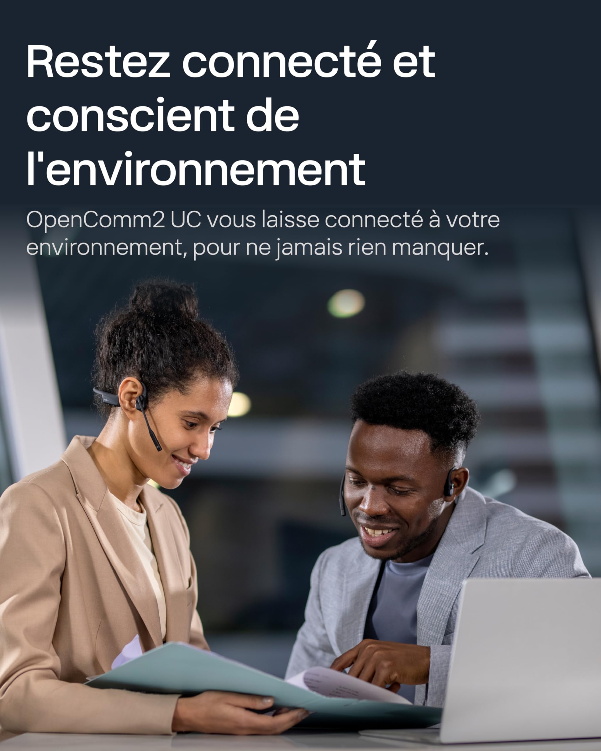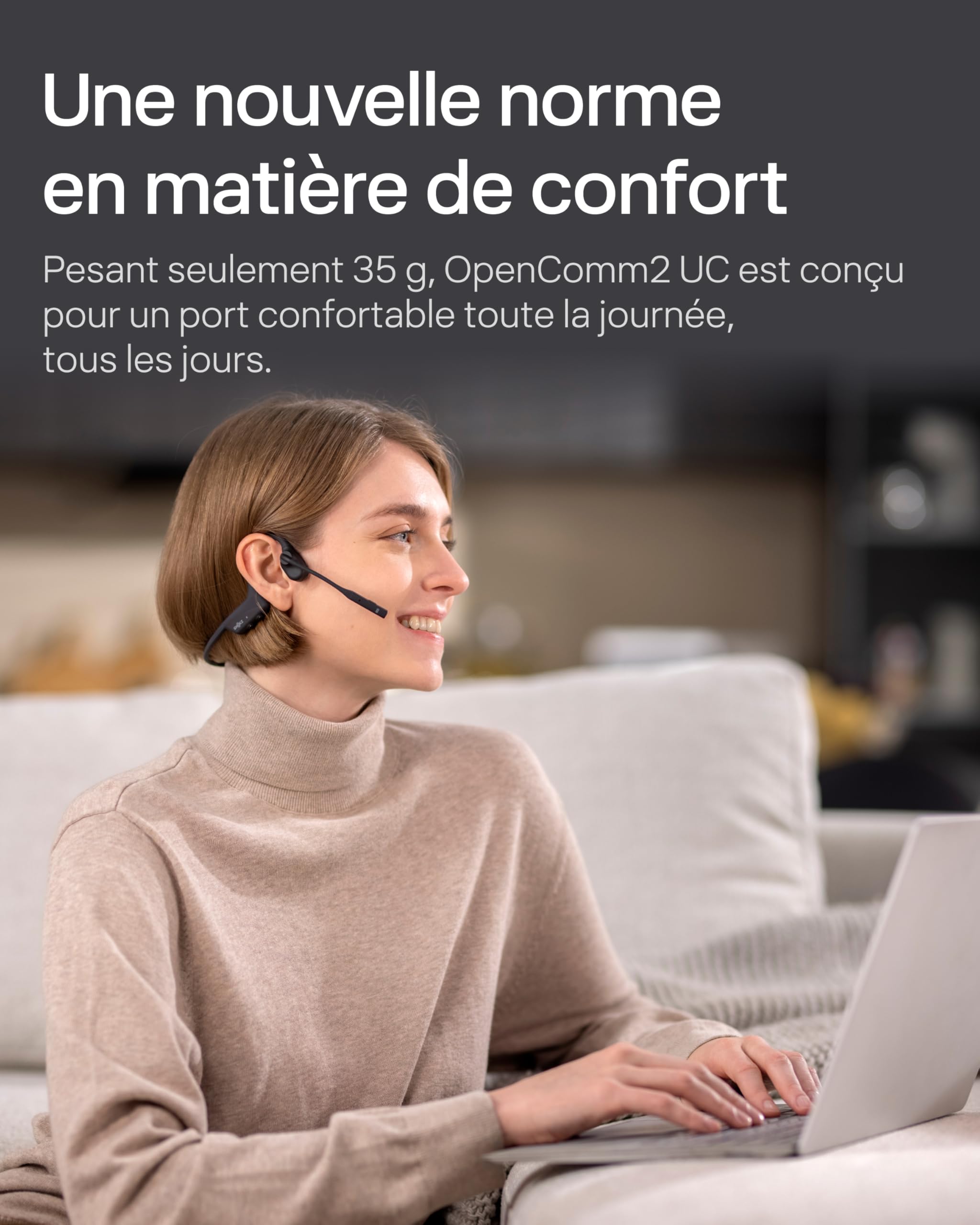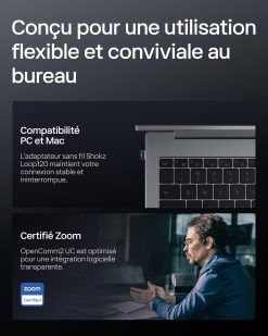 - Conception à oreilles libres pour le Confort : Contrairement aux casques traditionnels qui couvrent vos oreilles et vous isolent de votre environnement, la conception à oreilles libres de l’OpenComm2UC vous permet de rester connecté au monde. Pesant à peine 35g, vous ne les remarquerez presque pas. Avec un cadre flexible enveloppant et une finition en silicone souple, l’OpenComm2UC offre un port facile, sans effort et toute la journée.